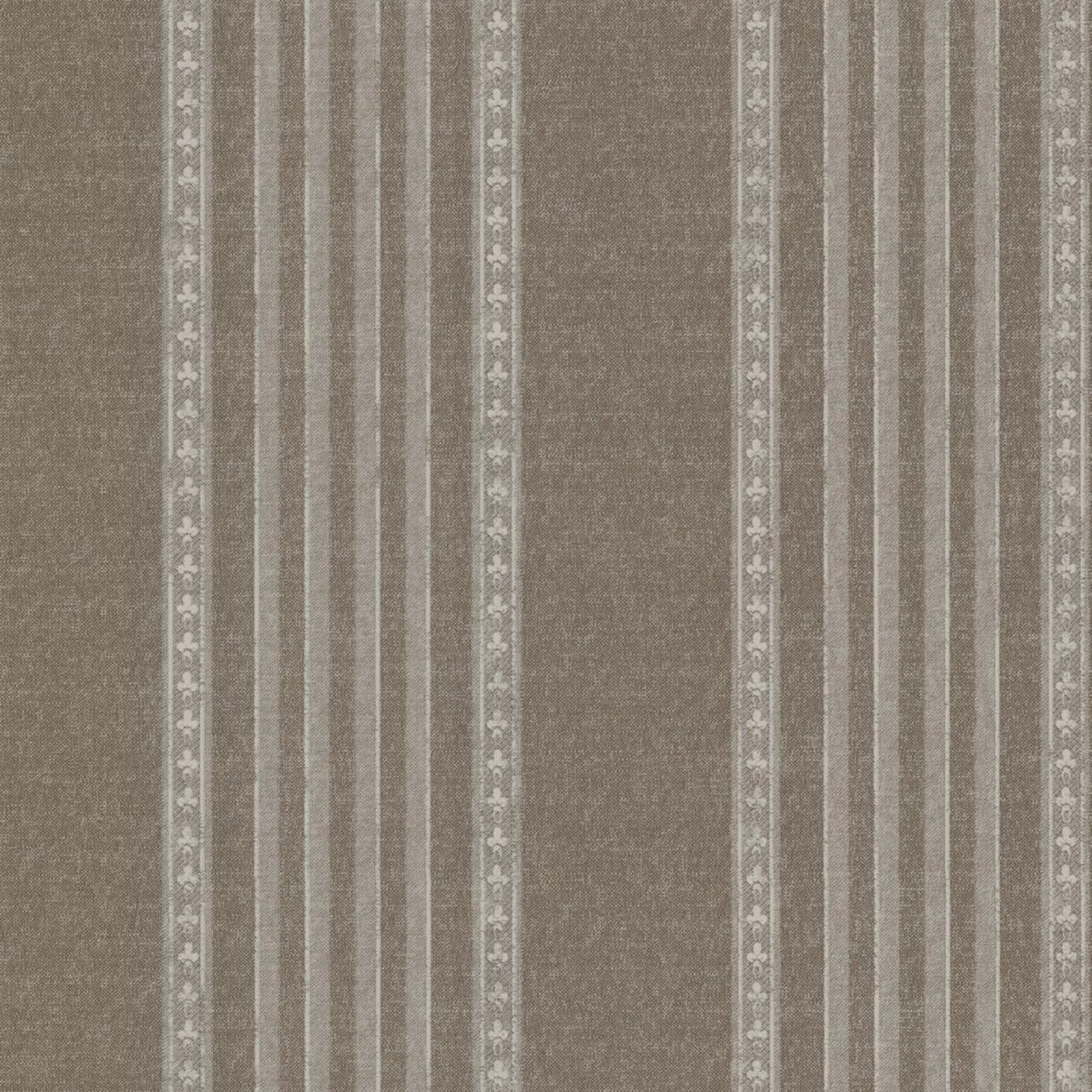 - Warm brown print with lighter vertical stripes featuring small fleur de lis