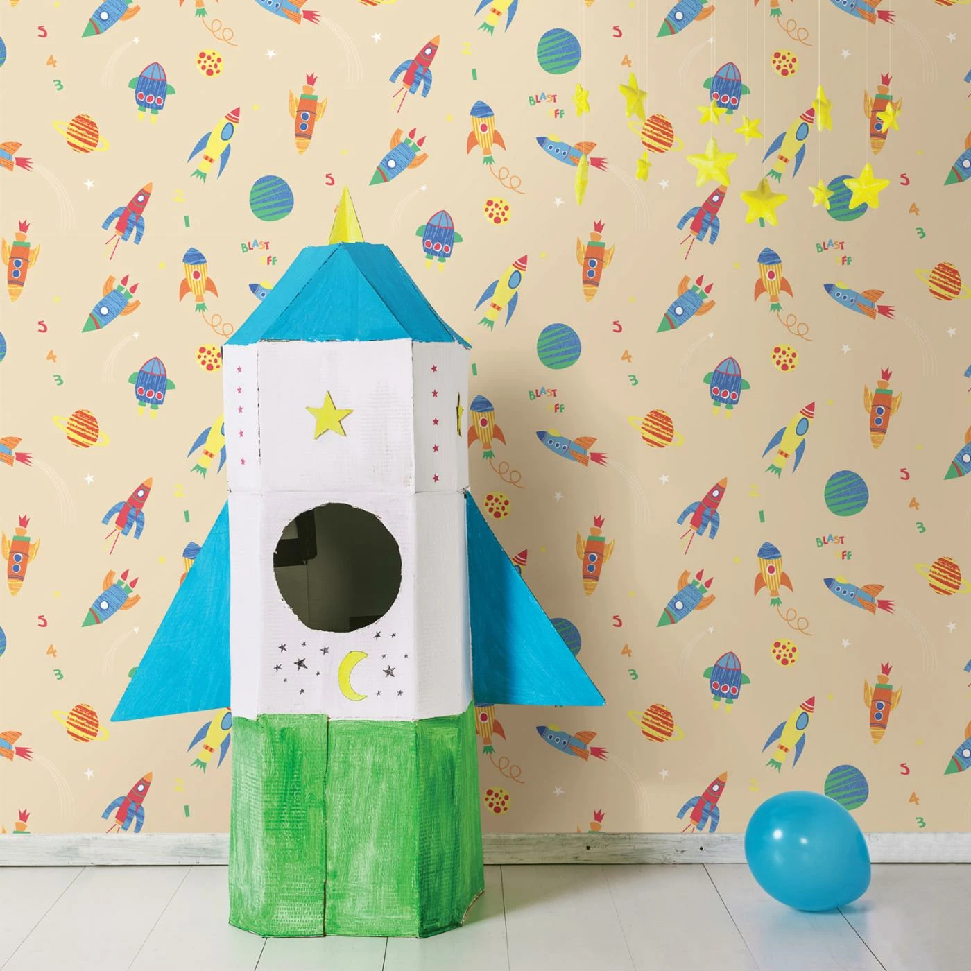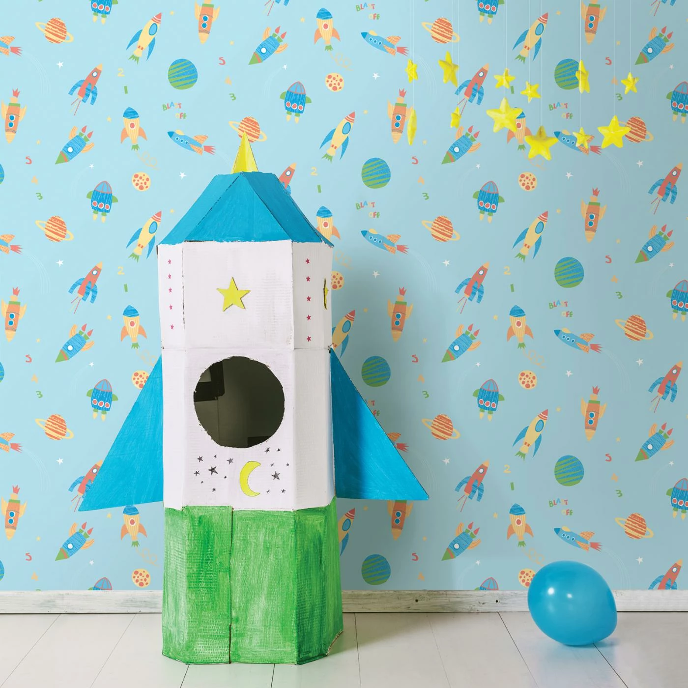 Ready your kid’s room for take-off with the Brewster Blast Off Outer Space Wallpaper. This wallpaper design features a 21-inch drop match outer space pattern on repeat. It’s available in select color options for a custom look. This wallpaper is made of unpasted non-woven material and is both washable and may be stripped for easy removal.