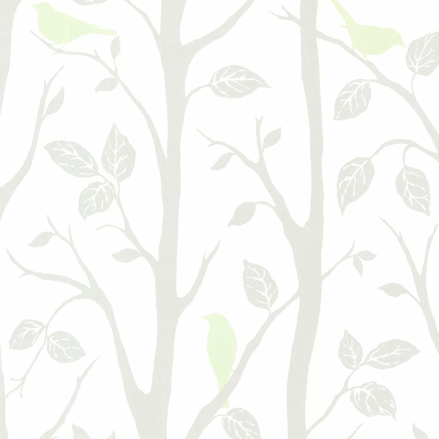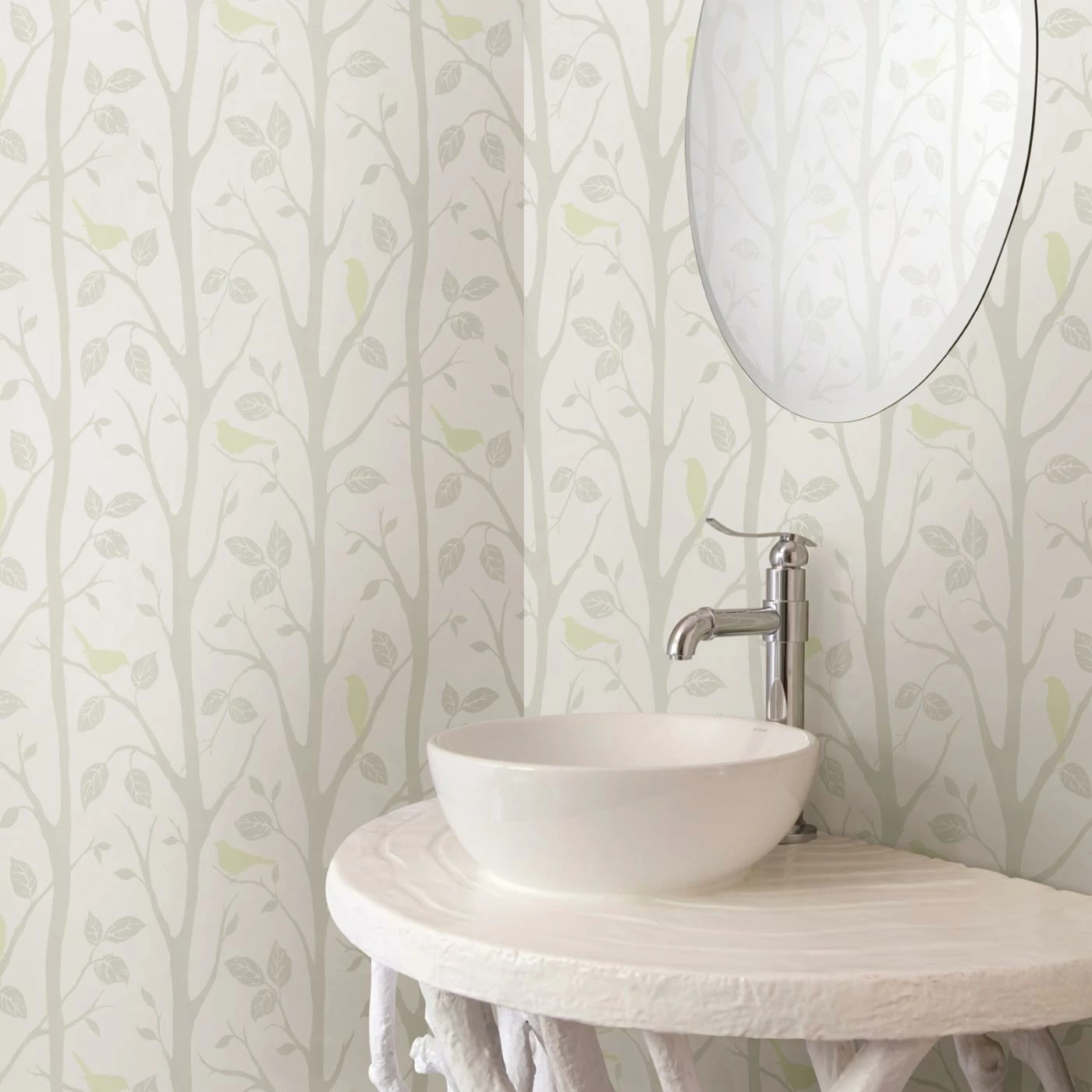 A light background and silvery, slender branches make a lovely home for little green songbirds on Brewster Corwin Light Green Bird Branches Wallpaper. This vinyl wallpaper is ideal for novice decorators with a prepasted backing and scrubbable surface. The pattern is repetitive every 21 inches and a single roll of wallpaper covers 56.4 square feet.