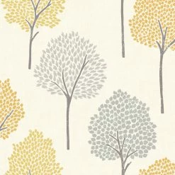 Add some springtime sauciness to your home with the Brewster Essentials Andover Eula Wallpaper. This paper features simple gray trees with mustard yellow and dark gray leaves. The design is rendered on non-woven paper with a non-pasted backing.