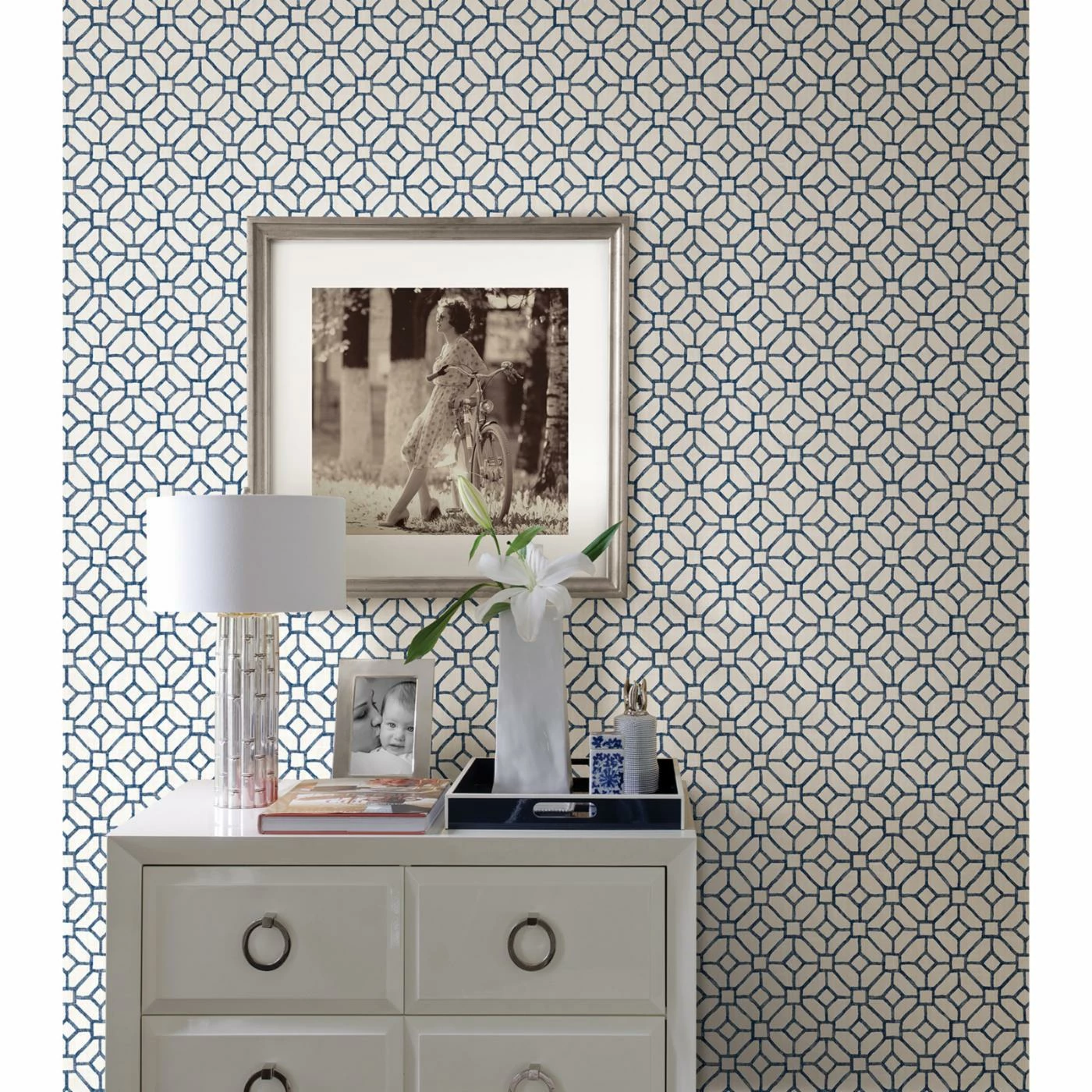 The Brewster Gigi Navy Geometric Wallpaper boasts a bold geometric pattern in navy blue over a softly-hued gray background. The linen texture gives this chic wallpaper depth and drama. Its charming design looks lovely in virtually any space of your modern home.