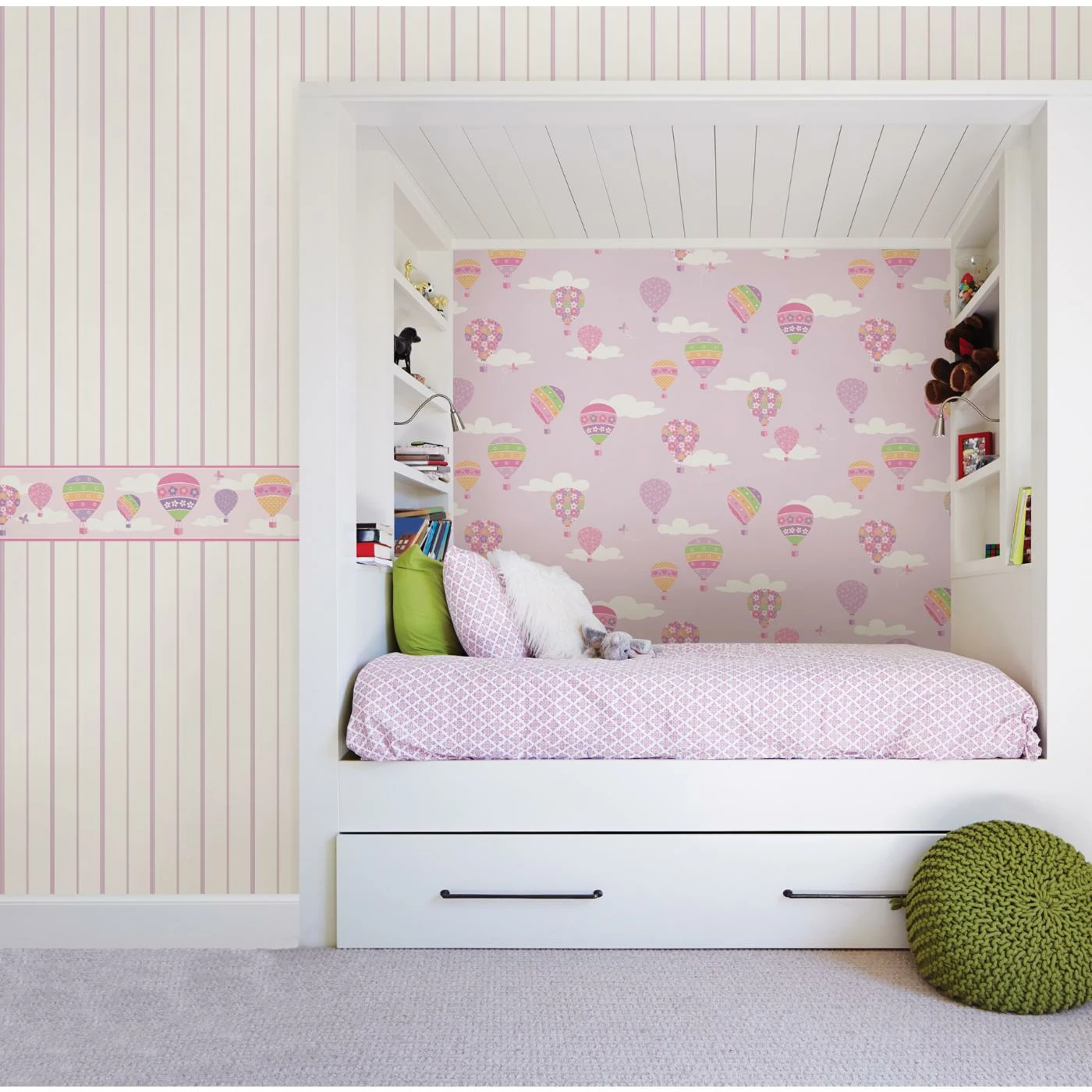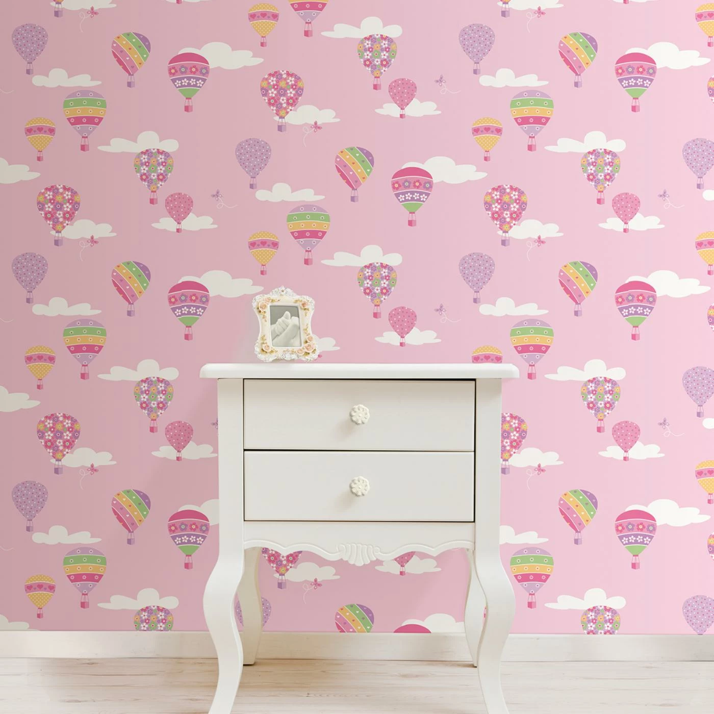 - Hot air balloons and butterflies print wallpaper available in a variety of colors