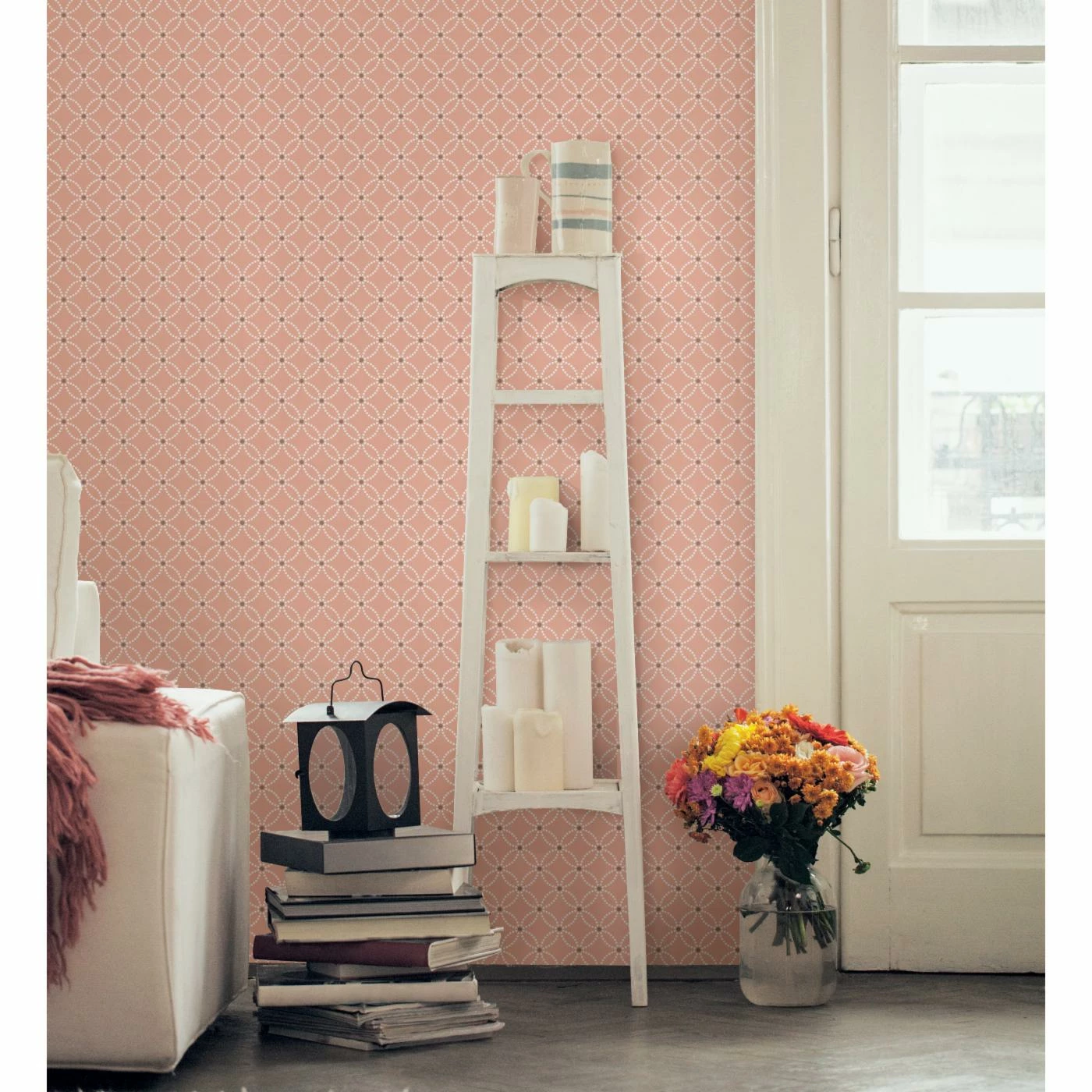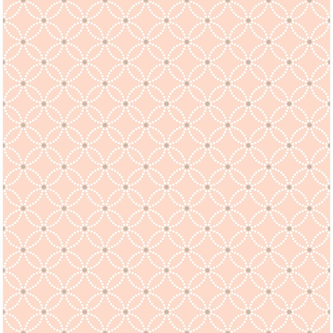 Lend a cheery color scheme to any space with the Brewster Kinetic Salmon Geometric Floral Wallpaper, boasting colors of salmon pink, white, and platinum. This eye-popping wallpaper features a geometric design with overlapping circles comprises of small dotted lines. Add it to your living space or bedroom to give your home a charming wall covering.