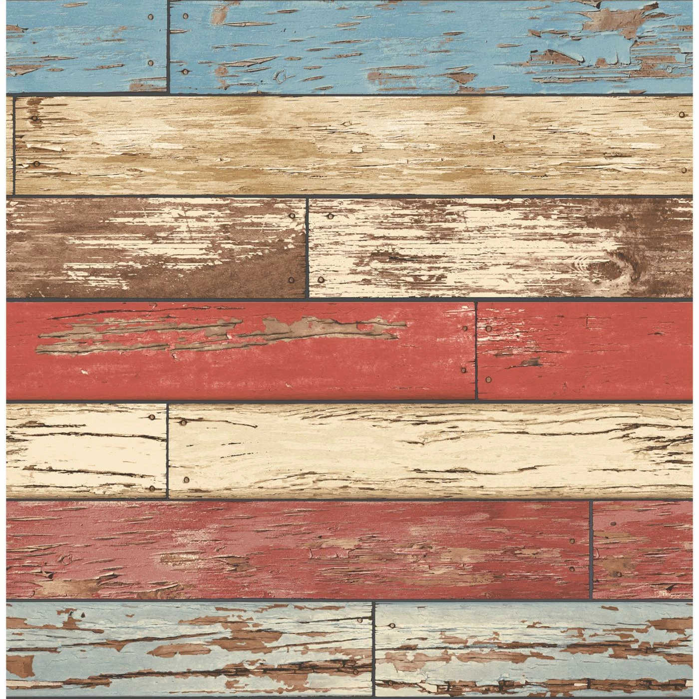 Bring rustic appeal to any room with the Brewster Levi Red Scrap Wood Wallpaper, featured in a faux wood plank design. Warm shades of red, cream, brown, and blue are presented in a distressed design for an authentic look. This wallpaper is sure to warm up any space and give your home a cabin-like feel.