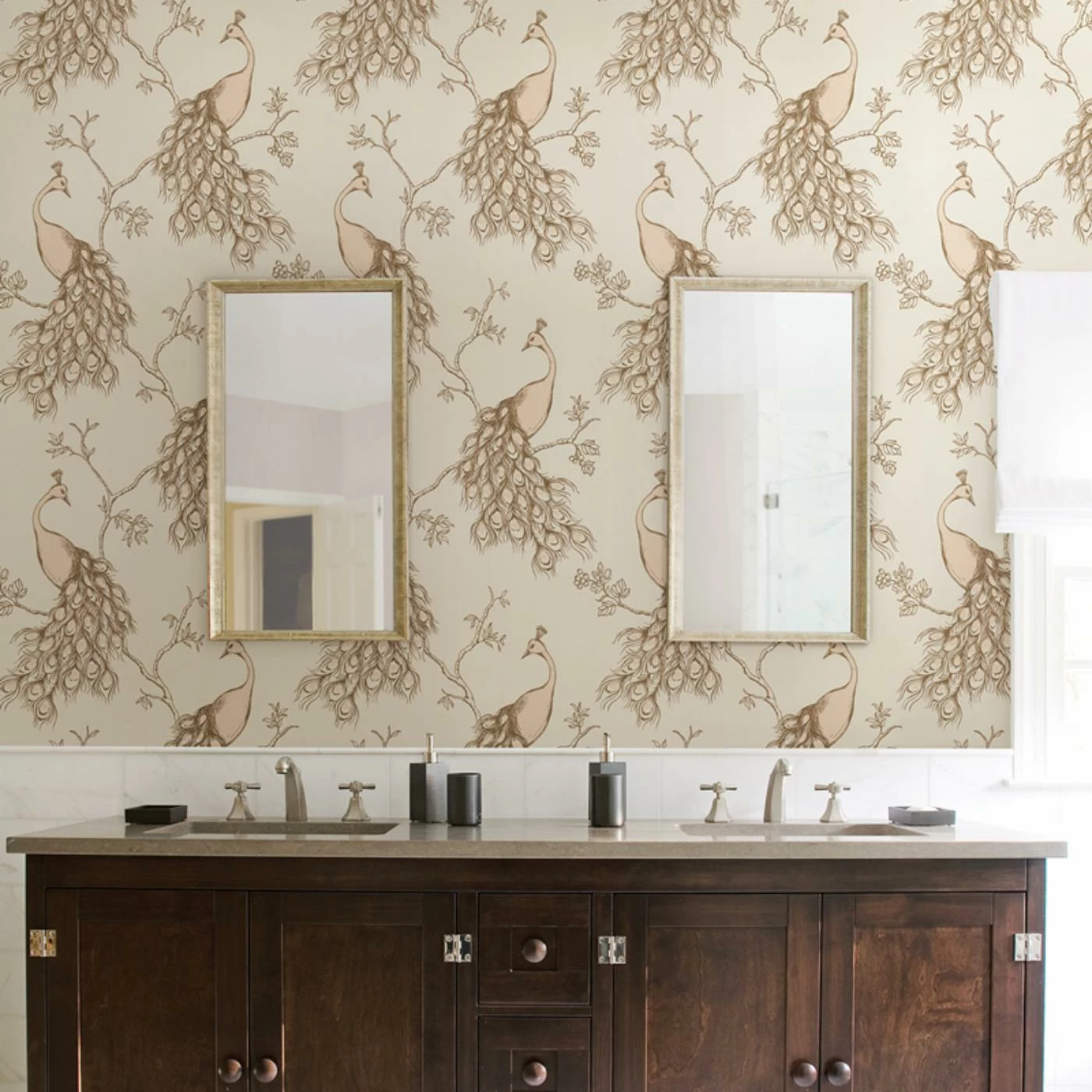 Metallic ink gives the vintage peacock pattern in the Brewster Prevost Peacock Wallpaper its glamorous edge. Your choice of color makes it perfect for your space. This wallpaper is made of washable, unpasted nonwoven material. Strip to remove when you’re ready for a new look.