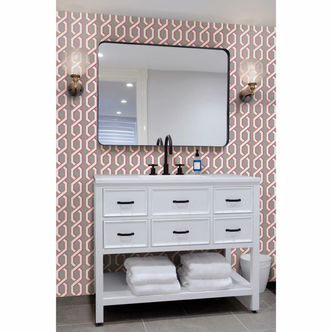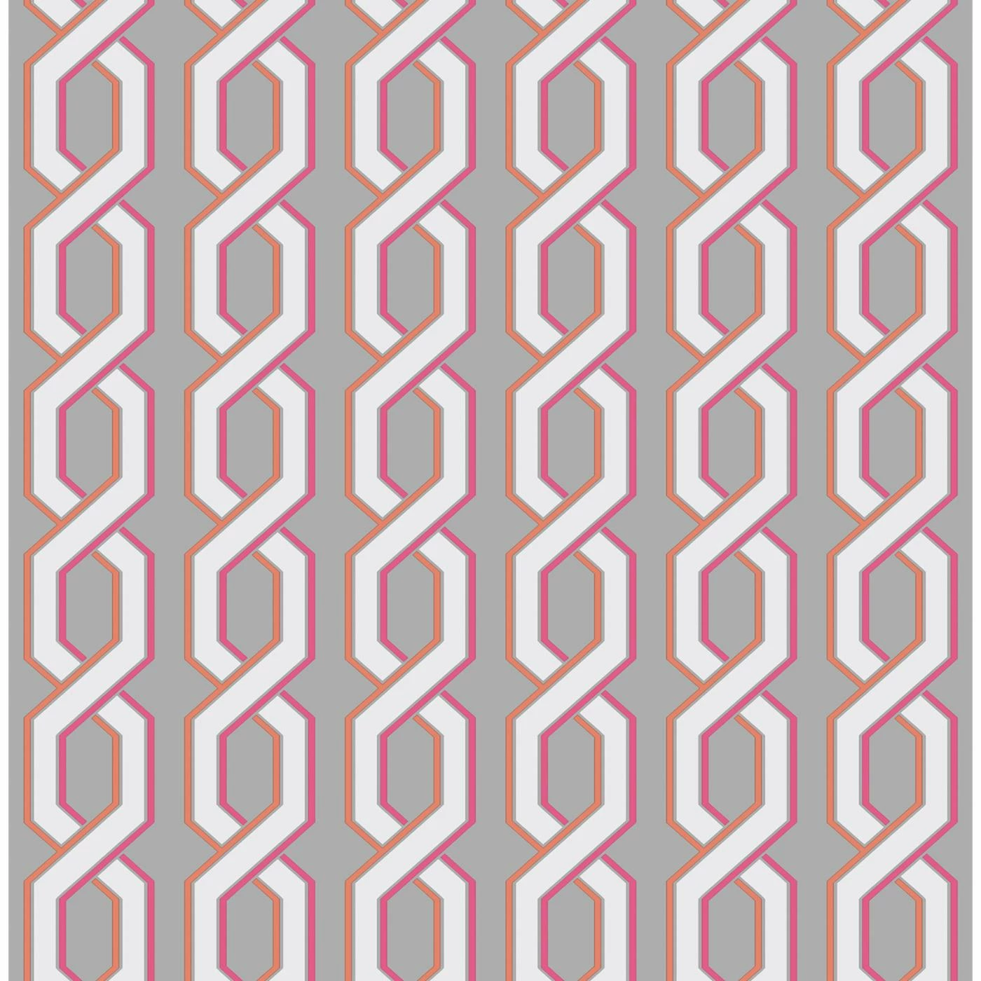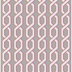 Infuse your space with vibrant color and modern patterns with the Brewster Twist Pink Geometric Wallpaper. A combination of bright pink and orange lines surround twisted geometric shapes in white on a gray background. Install this unique wallpaper in your bathroom or bedroom and enjoy its eye-popping look.