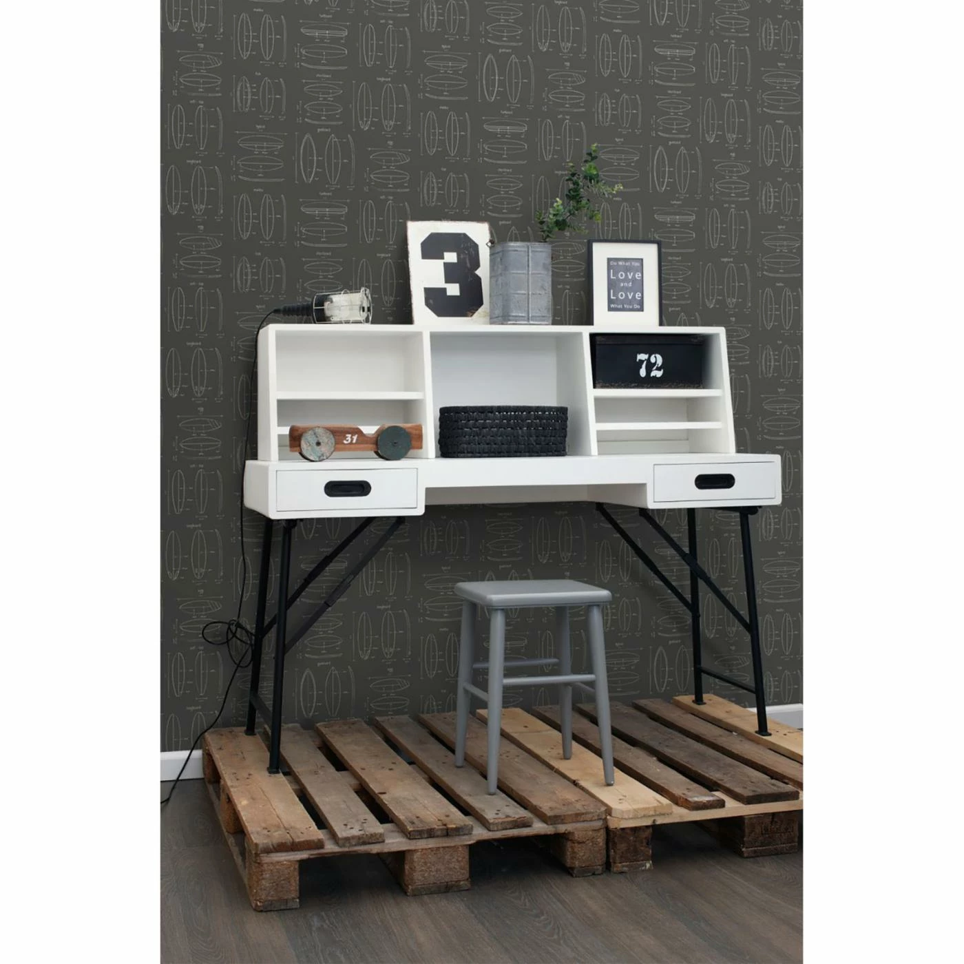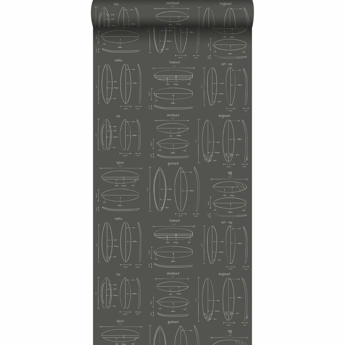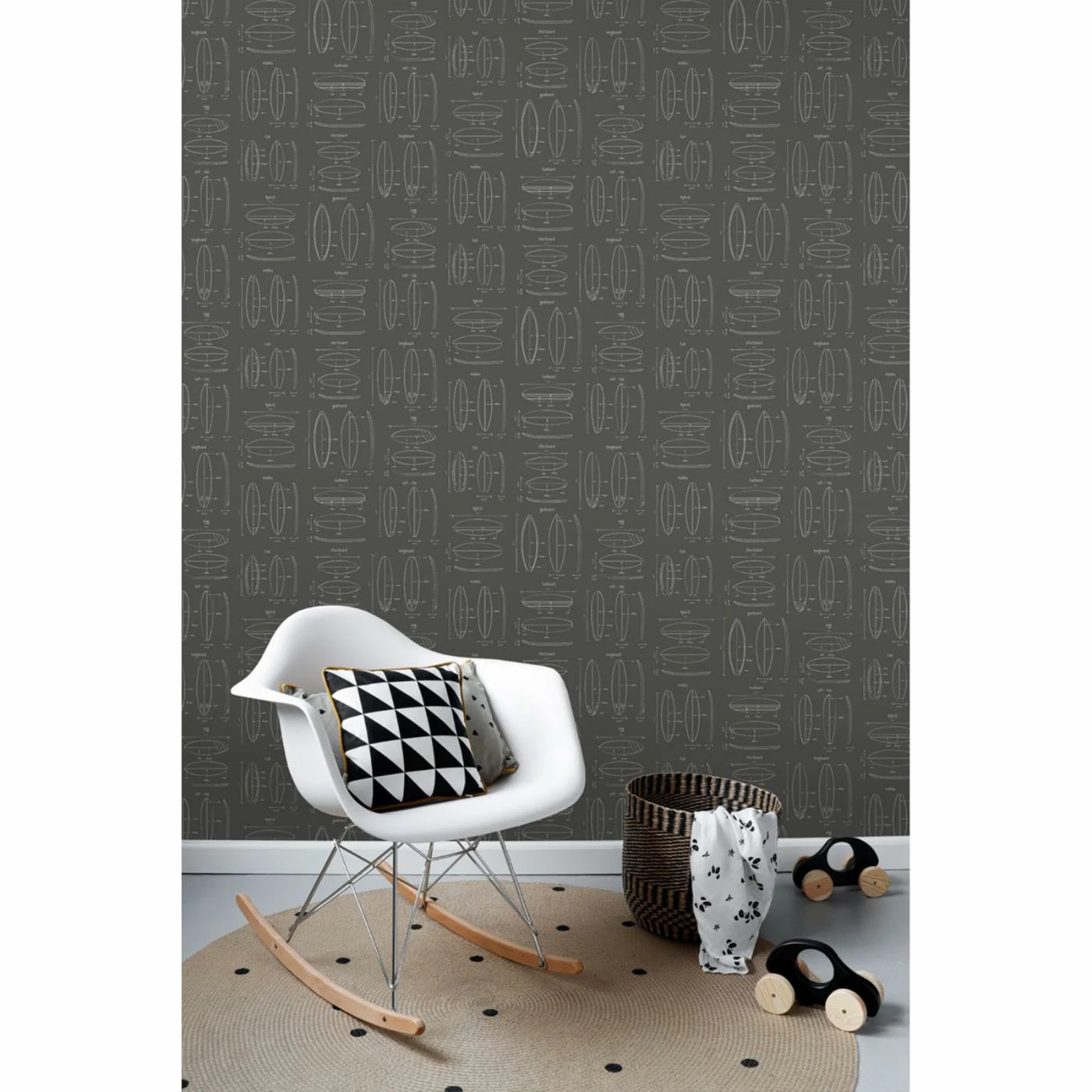 Celebrate your love of physics, surfing, or both with the ESTA Home Design Department Cosette Equations Wallpaper. This wallpaper has a gray background with white diagrams of a number of different surfboards drawn on it. The paper is non-woven, washable, and has a non-pasted background.