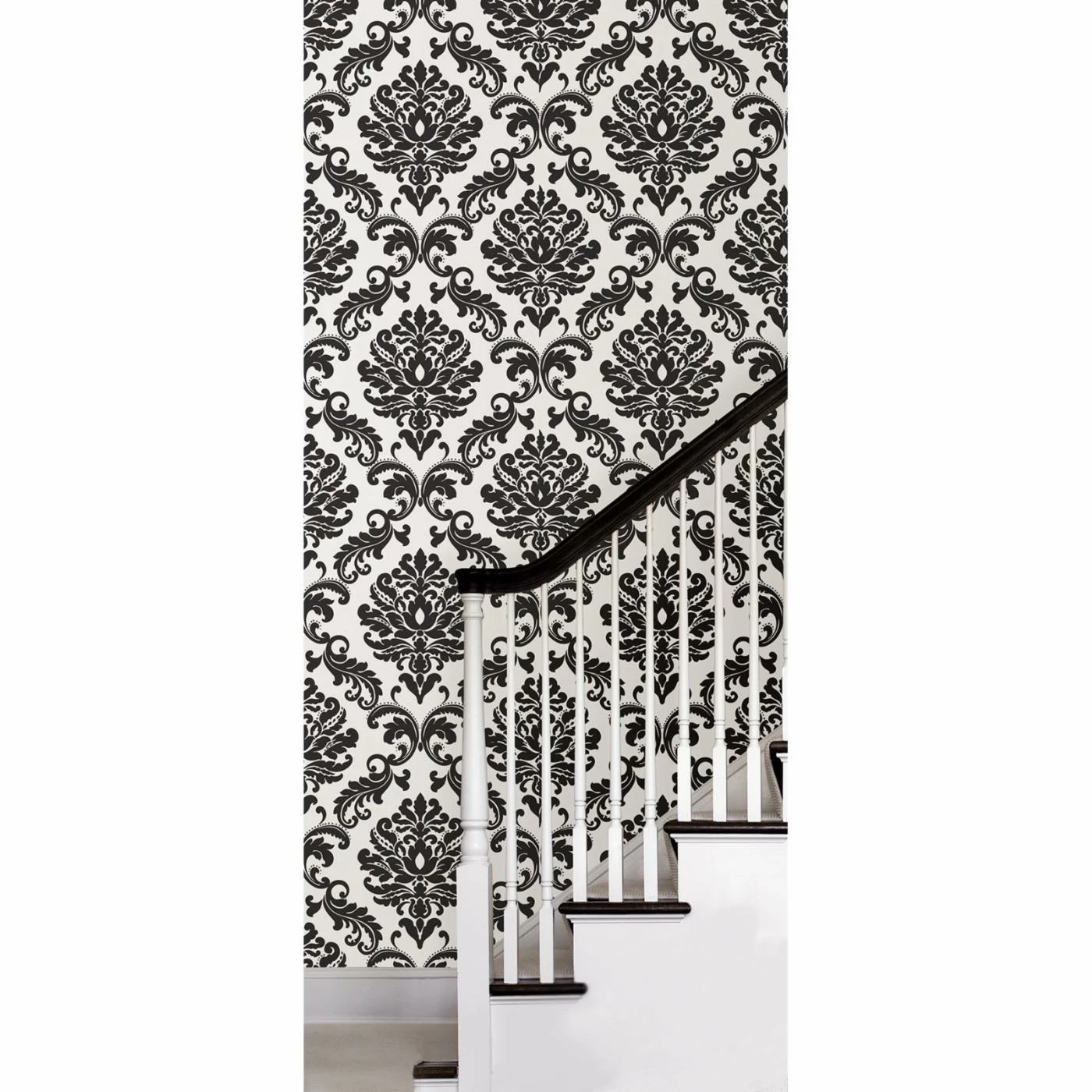 Create elegant contrast in any room with this Brewster Ariel Damask Peel and Stick Wallpaper. Bold black and white in a damask pattern gives your home a chic makeover without all the worry and work of permanent wallpaper. Made from vinyl for effortless cleaning, this temporary wallpaper is designed to peel and stick over primed or painted walls and is easy to remove without damaging your walls.