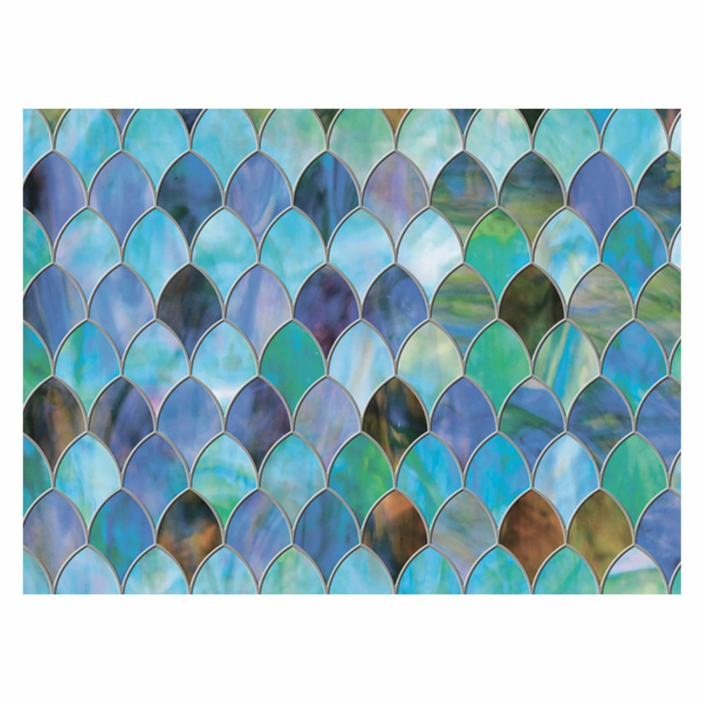 Soothing blues and greens give the Brewster Peacock Window Wallpaper a striking light-filtering presence. Colored like a peacock’s feathers, this stained glass-inspired window wallpaper is sure to cast beautiful shadows while lending a bit of privacy to your room.