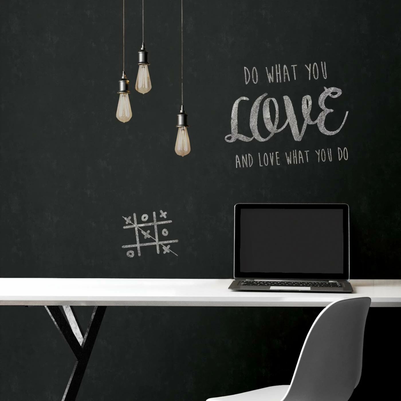 Transform your living room, kidsโ bedroom, and any other surface into a fun, usable surface with the NuWallpaper Vintage Chalkboard Peel and Stick Wallpaper. This wallpaper is made from vinyl with a chalkboard black surface that you can really write on! Just peel away the backing and press to the surface to adhere. When youโre done, just peel away the paper, leaving no residue.