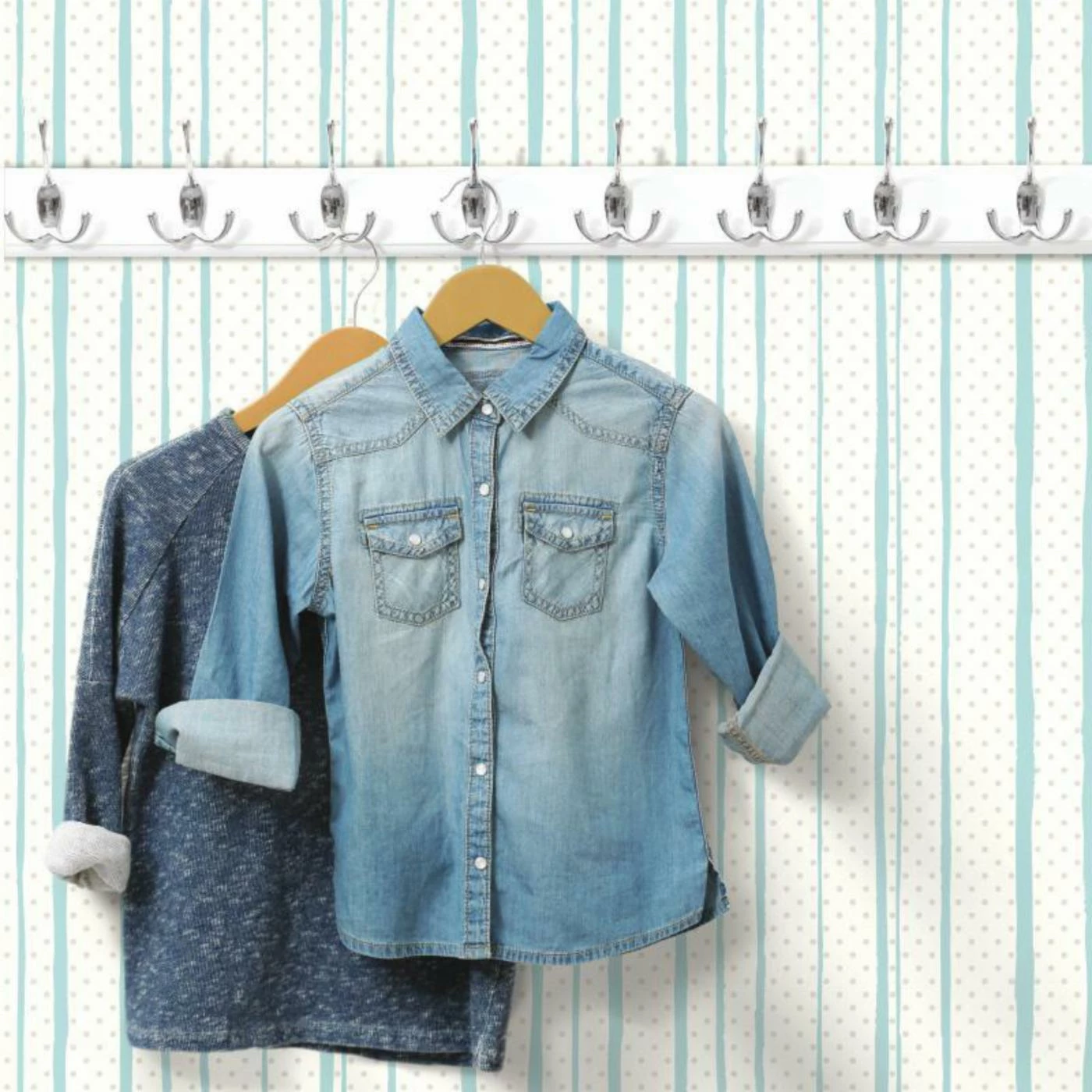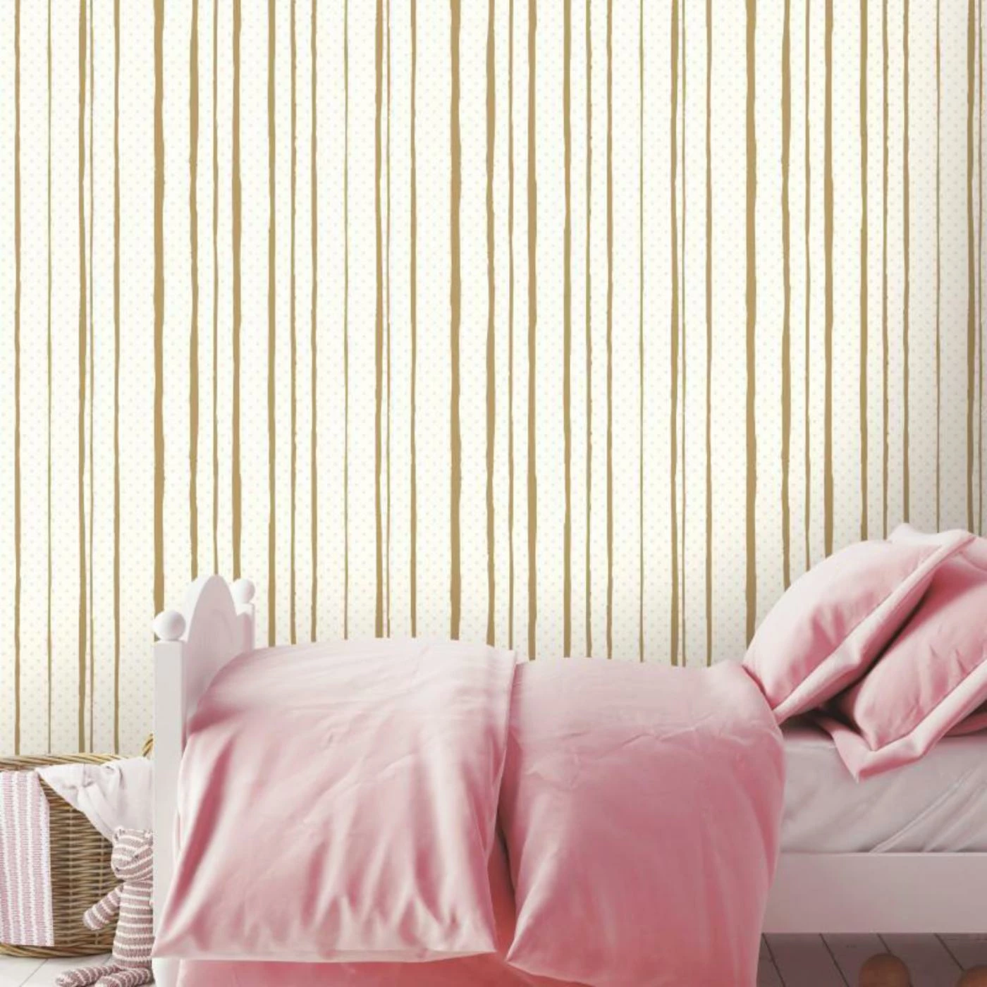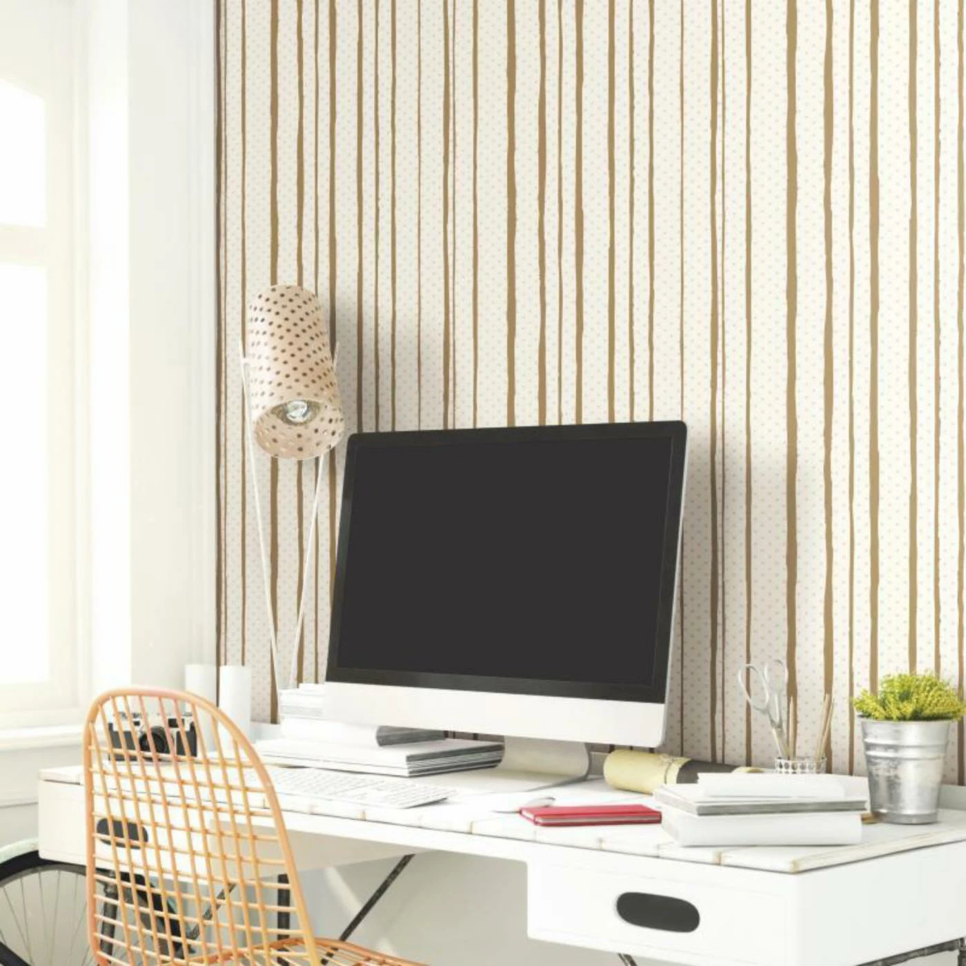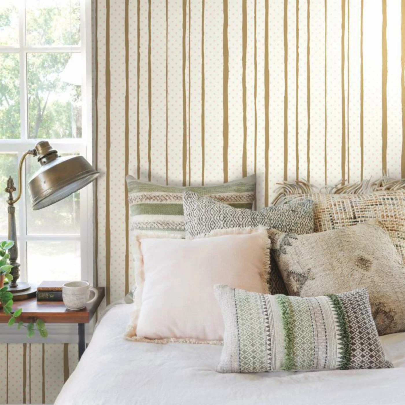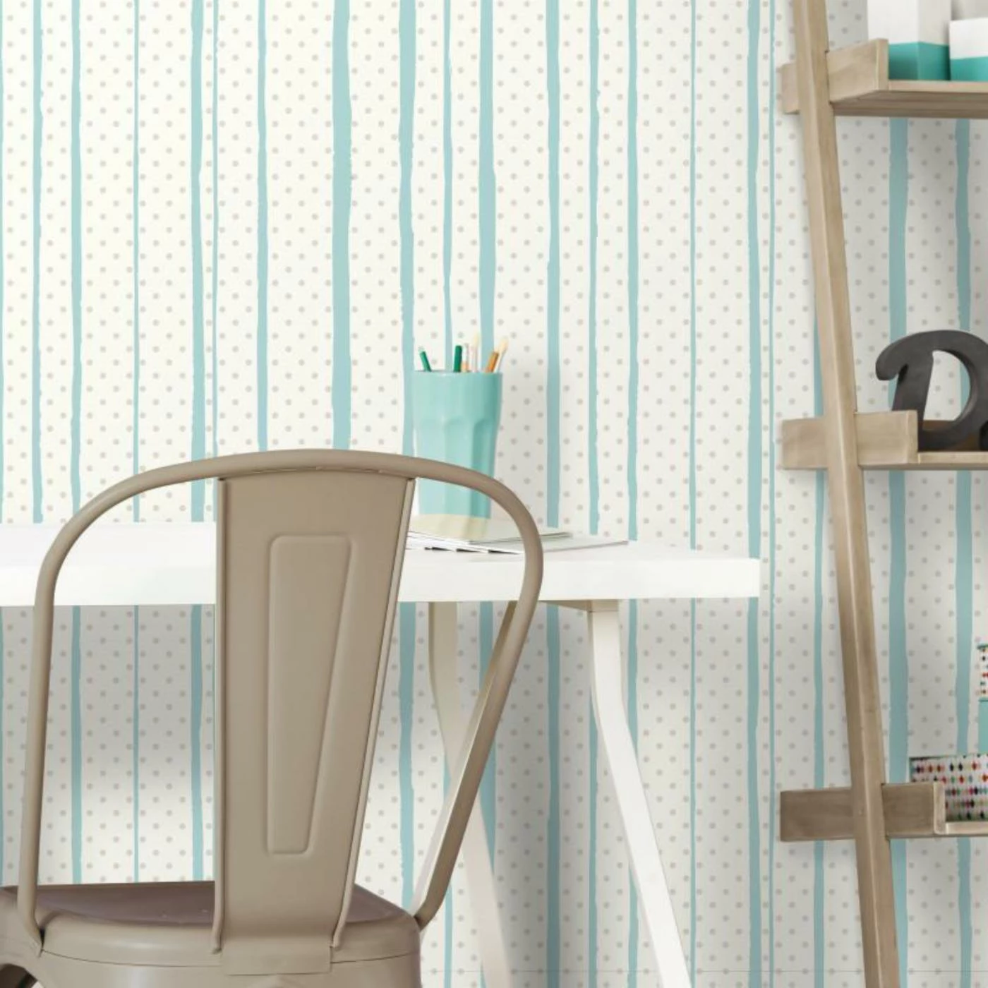 The RoomMates All Mixed Up Peel and Stick Wallpaper offers a fresh and fun way to update your dΓ©cor. Available in your choice of color, this self-adhesive wallpaper features a stripe and polka dot pattern. Installs and removes quickly and easily without damaging the surface of the wall.