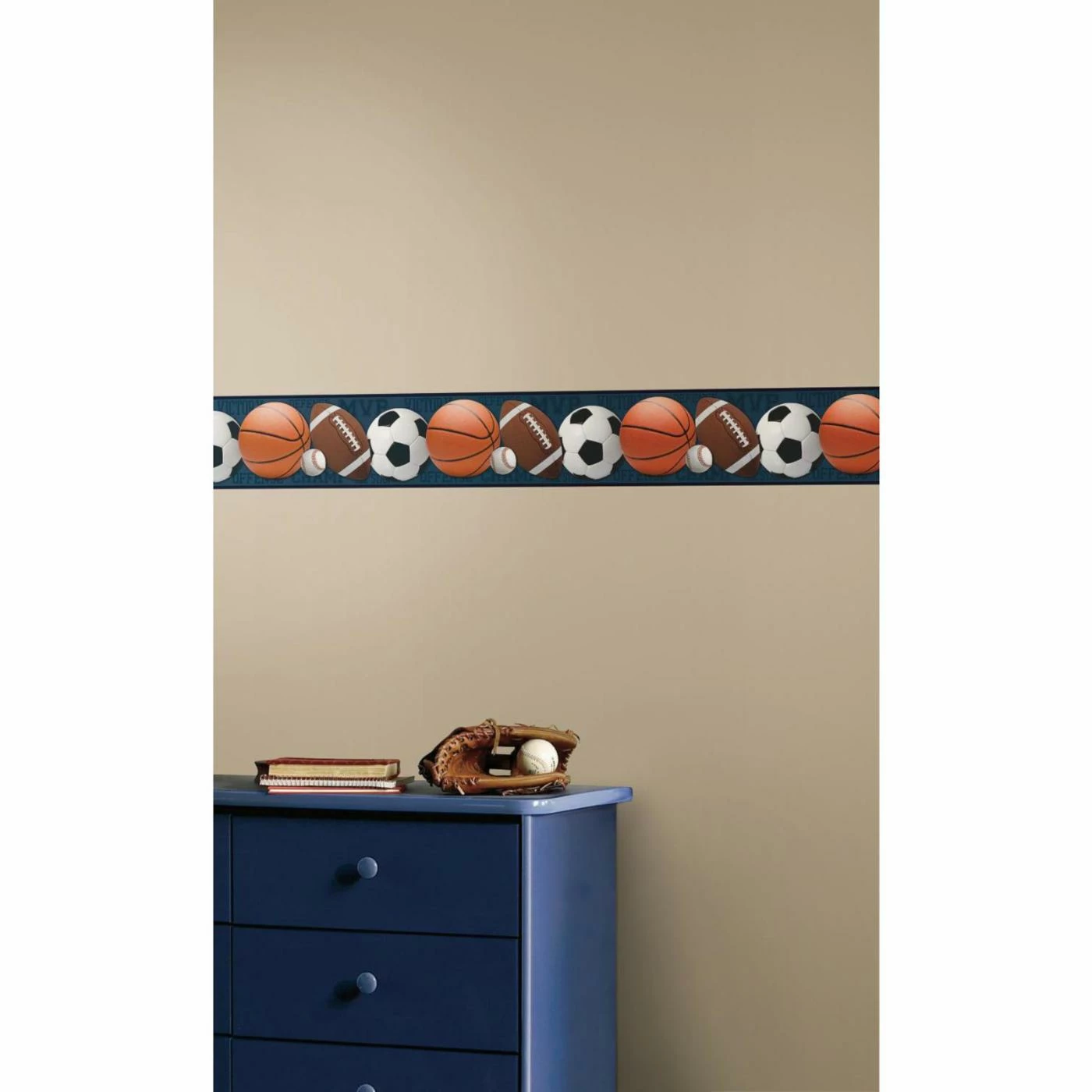 The RoomMates Sports Balls Peel and Stick Wallpaper Border makes it easy to install new wallpaper. This self-adhesive wallpaper border features the trappings from some favorite sports, along with relevant terms in the background. The peel-and-stick wallpaper is made from vinyl, and can be wipe clean with a damp cloth. If you find it necessary to remove or reposition, the adhesive won’t leave a tacky residue.