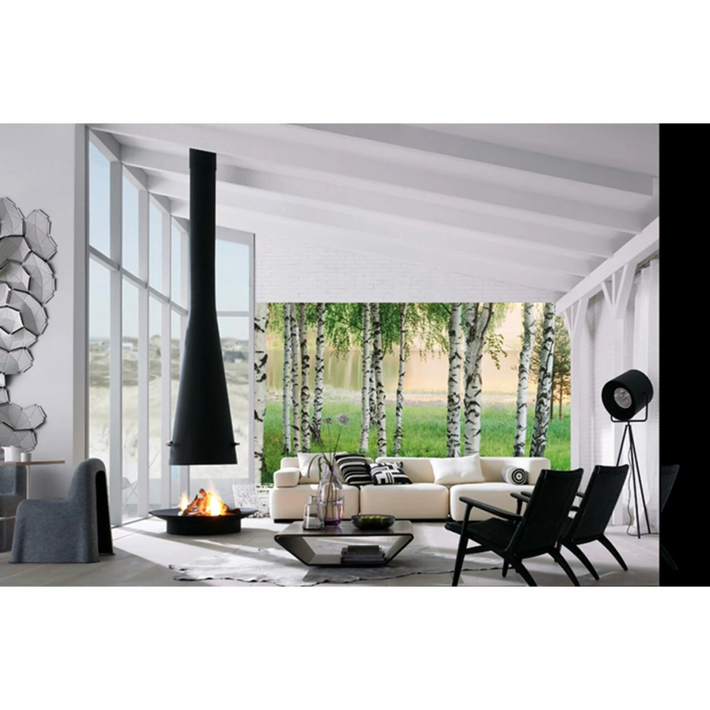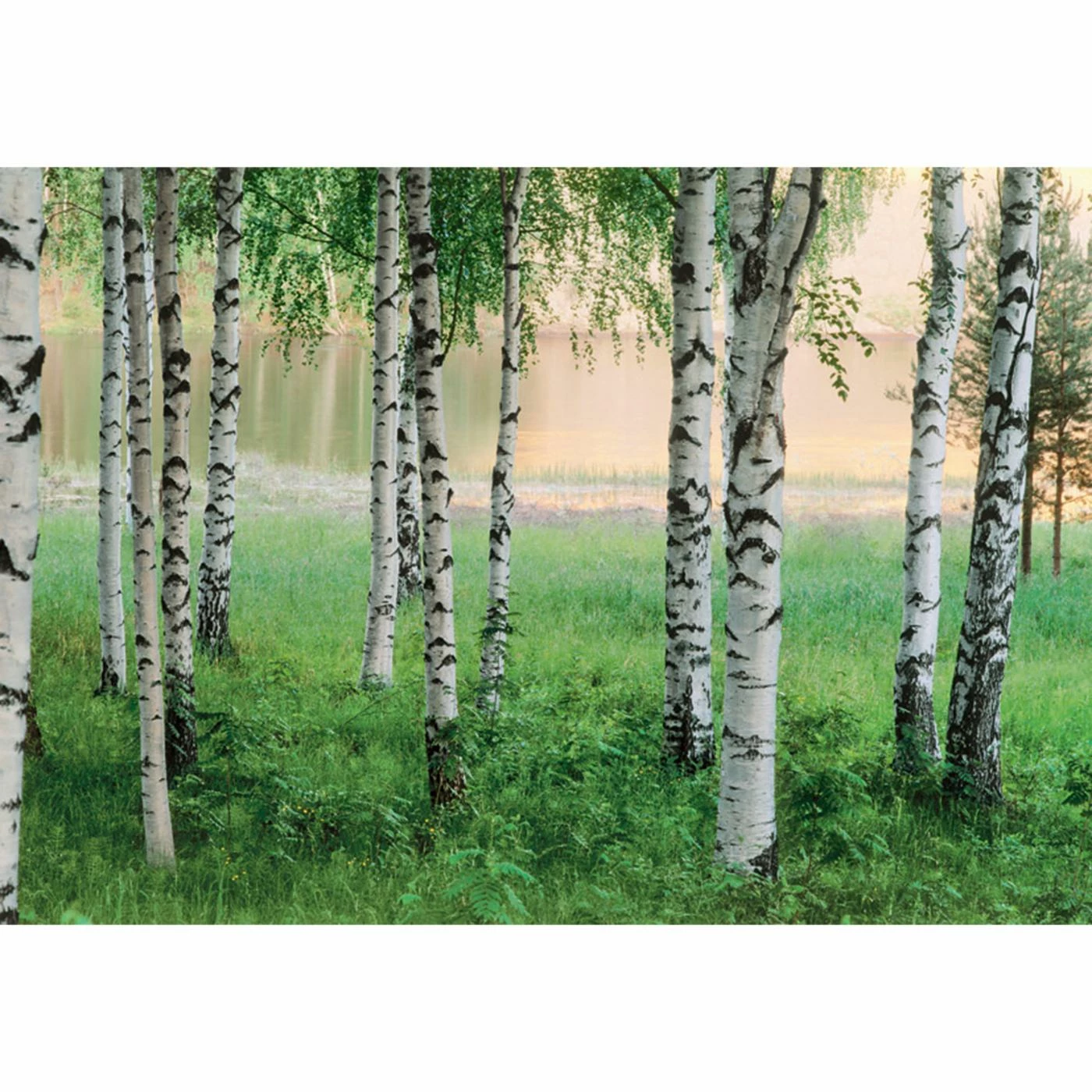 Bring the outdoors inside with the Ideal Decor Nordic Forest Wall Mural. The photographic image showcases birch trees in lush grass near a glassy lake.