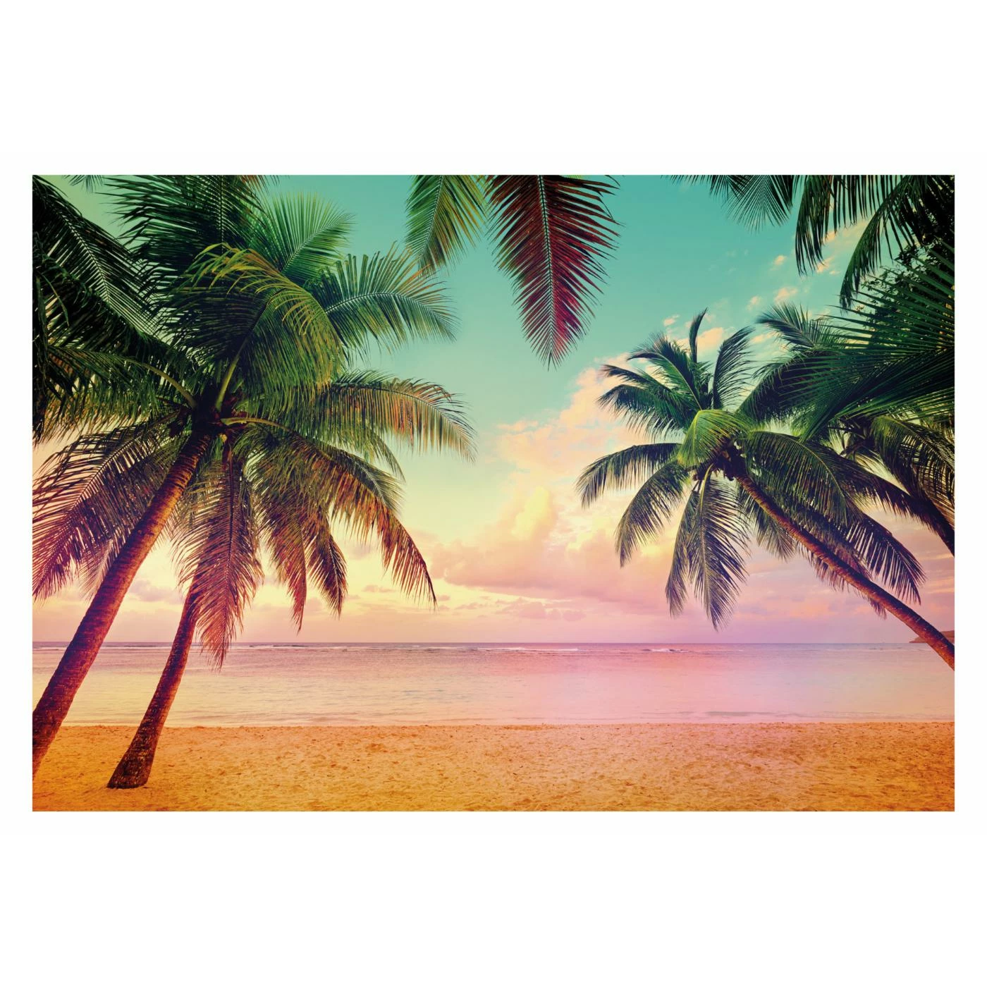 Enter a sun-bronzed state of mind with Komar Miami Wall Mural. This unique photo-realistic wallscape carries you away to a white sand beach with graceful palm trees. The glowing pink sky creates your own personal endless summer.
