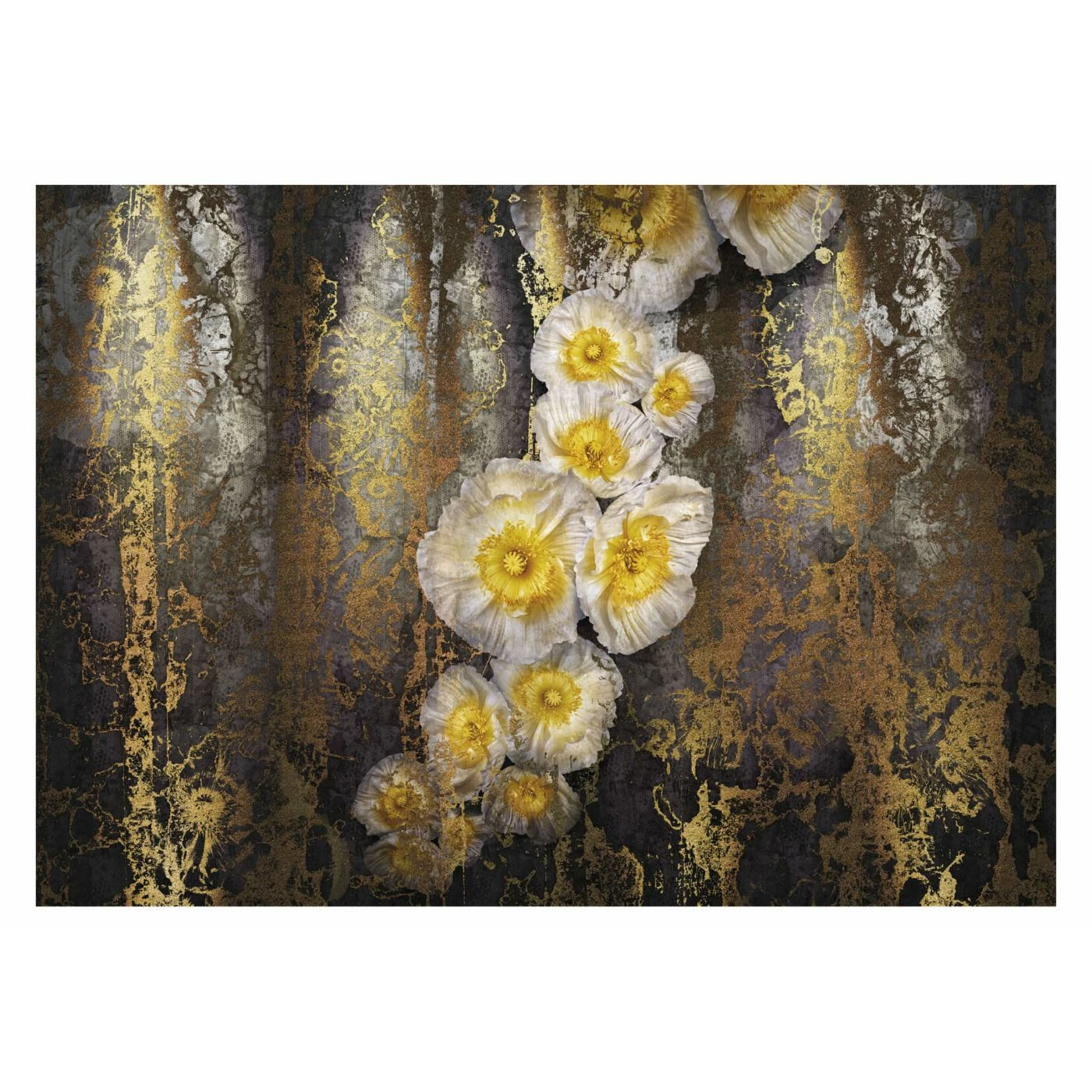 Dress up your home, apartment, or office with the lush Komar Serafina Wall Mural. A rivulet of white and yellow poppies done in intricate detail form the focal point. The darker background is wavy like a curtain or like corrugated metal, and is adorned with gold filigree in an abstract design. This mural suits a range of styles from industrial to transitional glam.