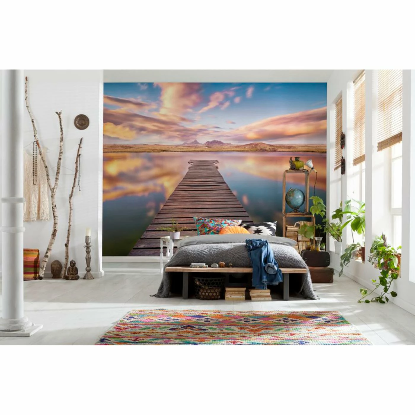 An expansive sky with sunlit clouds meets a glassy lake and wooden pier on the Komar Serenity Wall Mural. This photographic image features the tranquil scene and displays the combination of exceptional detail and color.