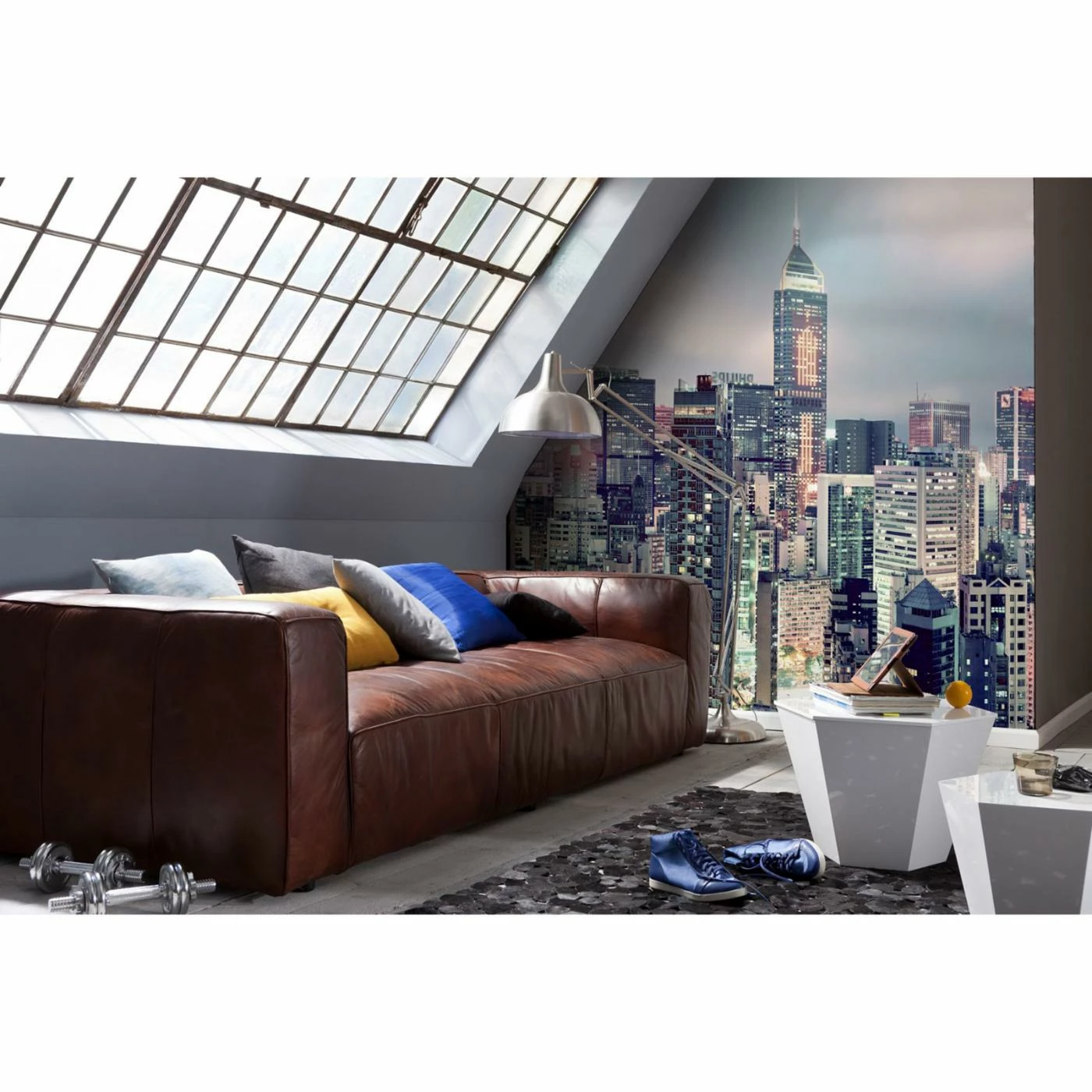 Give your home an urban loft feel with the Komar Skyline Wall Mural. The photographic image showcases city lights at twilight and makes any wall a focal point.